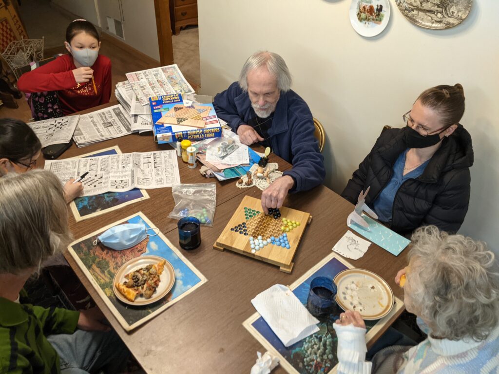 We visited Gram and played Chinese Checkers with her.