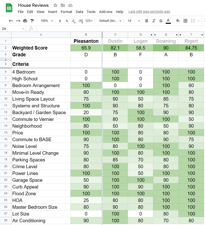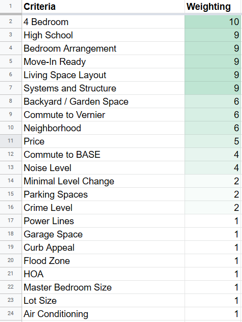 The weighted score sheet was conceived after we made an offer on a house that didn’t meet our needs, and we got caught up on it emotionally. Graciously, we didn’t get the house, and our realtor helped us clarify our goals. The score sheet gives us quantitative data on how well a house will meet our needs and eliminates some of the emotional decision making.