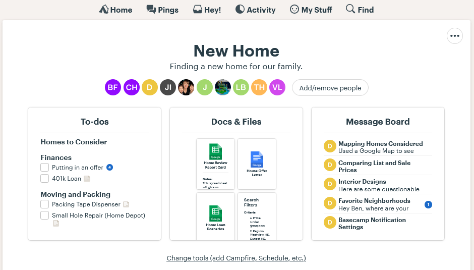 We use Basecamp to loop in our family and realtor in one place. I use the to-do lists to keep me on track of tasks I need to do and I have a to-do list for the homes we’re considering. This gives me a running log of the houses we’ve considered and allows our family to see our progress.