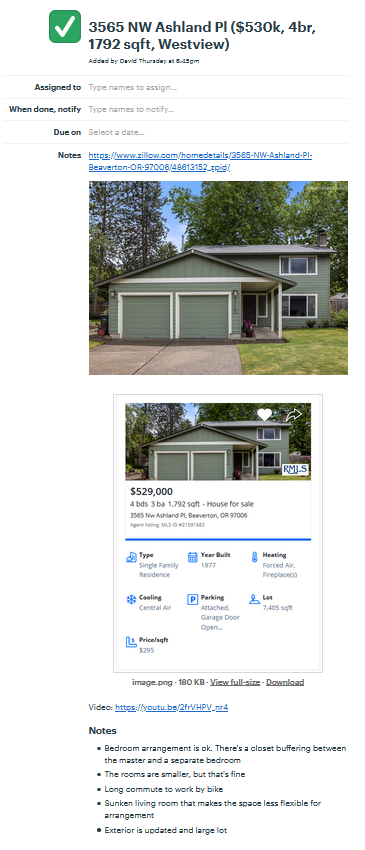 In the to-do description, I include a link to the listing on Zillow, the initial photo from Zillow, a floorplan (if available), and initial notes about the house from the listing. If we tour the house, I also embed the YouTube video.