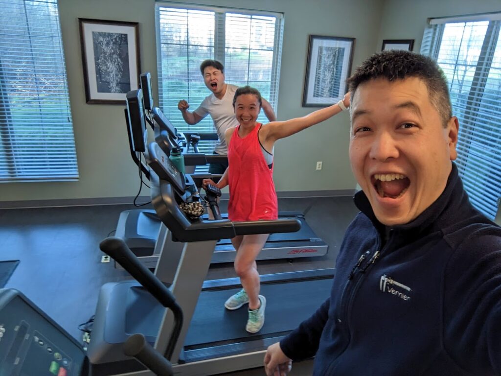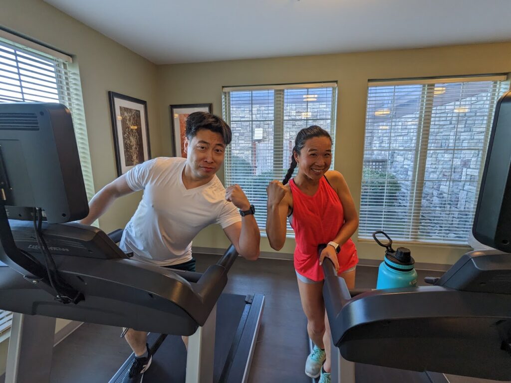 Looking to recap the fun evening together, I joined him in the fitness room, and just minutes later, we were surprised to see the newlywed bridge Emily enter for a run.