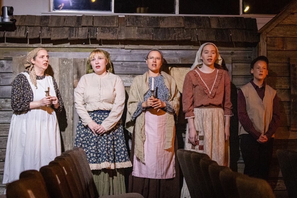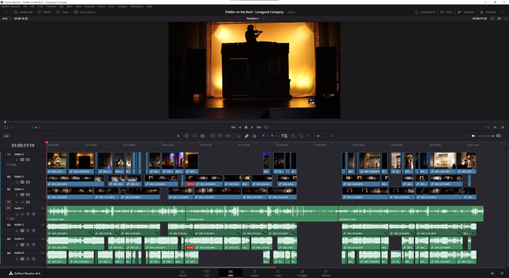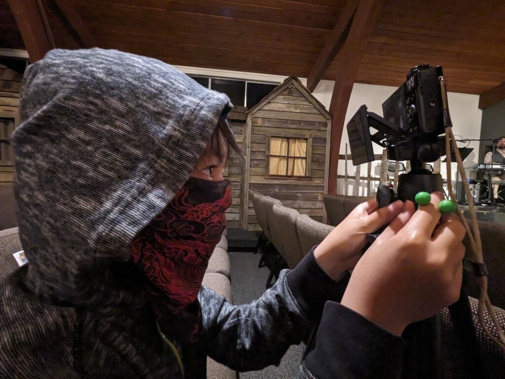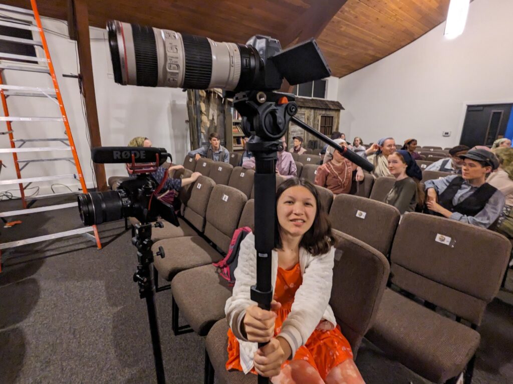 For the videography, I used three cameras, so I enlisted Kadie and Bruce to be my camera crew. The whole family had a part to play and the offstage crew were troopers. I had some experience recording Violet’s choir performances, but the long runtime posed challenges I hadn’t encountered—specifically around storage and power.