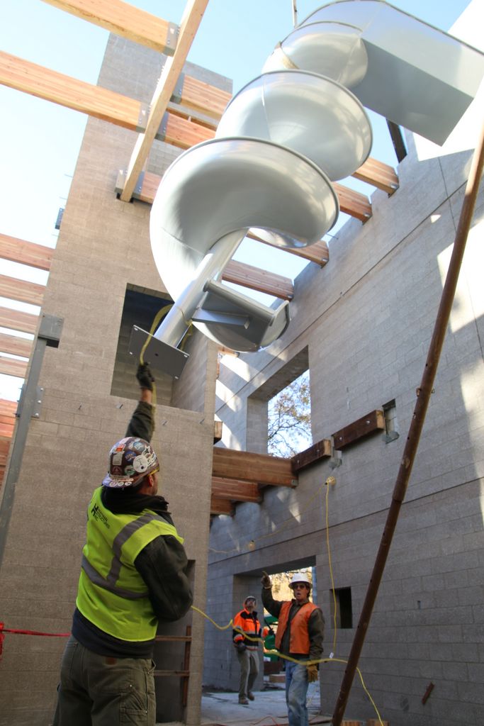 The famous curly slide at Vernier first arrived at the warehouse and it took a crew to drive it over to our building addition during construction and craned into its location. While it may seem superfluous to have a slide in the office, it reinforces Vernier’s culture of fun at work.
