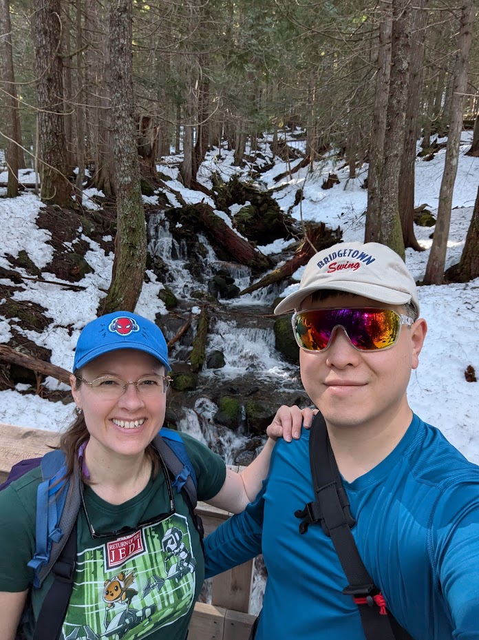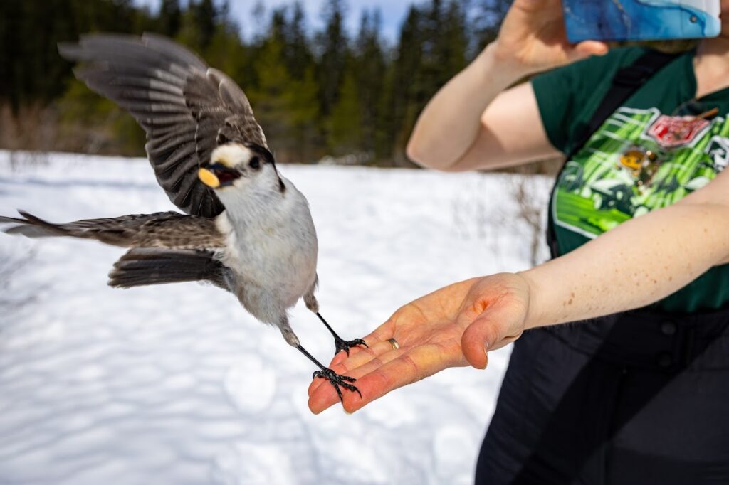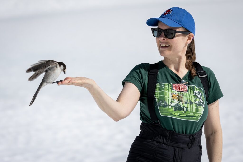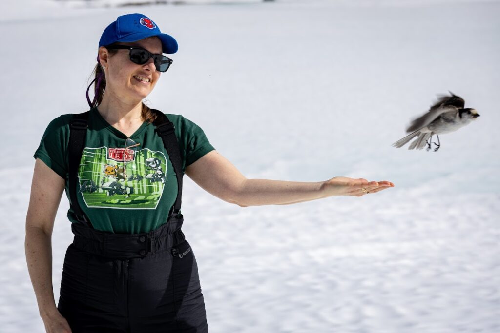 The following day, we hiked 3 miles out-and-back to Mirror Lake. While I was disappointed that the lake was covered in snow, we were delighted by the Canada Jays who were very eager to steal our trail mix. Jenni channeled her Disney princess persona (with the help of peanuts) to invite the birds to softly land on her hand.